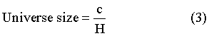 Again assuming H = 50, with proper units, this gives a size of 19.5 billion light years. The gravity reduction factor of about 2/3 is again sometimes applied as it is for age. Whether this length is universe radius, diameter, or even circumference depends on ones particular view of the geometry of space.