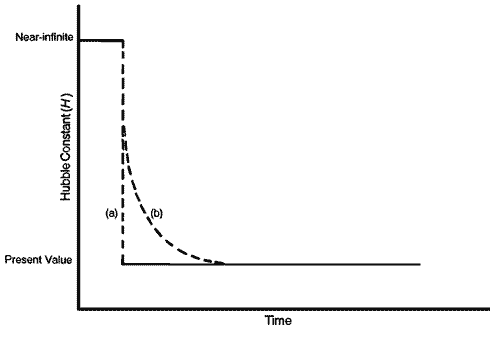 If a shorter creation time is selected, a partial day, then the Hubble value approaches infinity. Inflationary cosmologists, who support the extreme upper values for H, could never comprehend a value this large! My point is that the Hubble law simply does not apply to the creation period when the universe expansion rate was far beyond the speed of light. The Hubble law may well apply to the present-day universe, however, with galaxy recession proportional to distance. The H transition from Day Four to the present time may have been either a sudden drop or an exponential decay (dotted lines in Figure 1). Because of the singular nature of the creation event, there is no easy way to verify this alternative history for the Hubble constant.