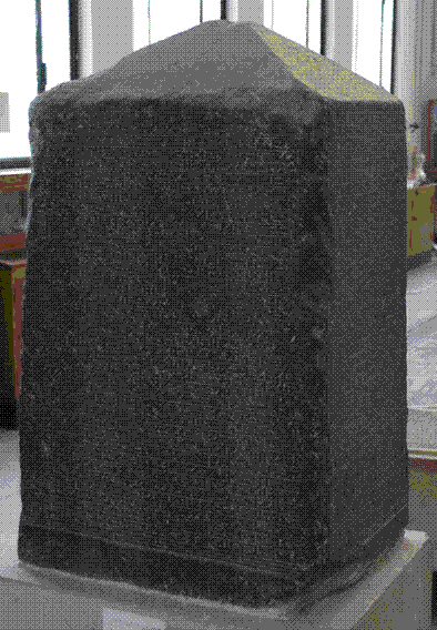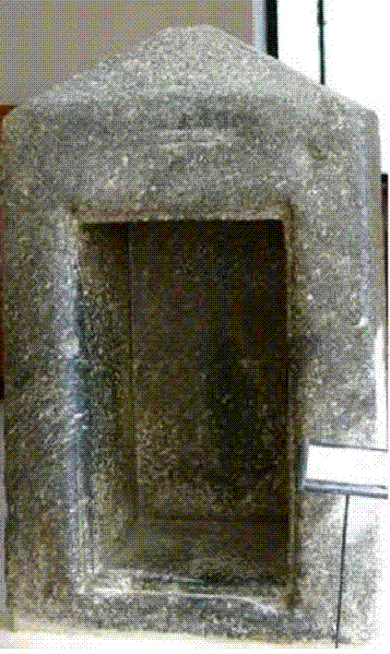This naos is of the Ptolemaic period when it was evidently used as a shrine. It is of black granite, pointed at the top, four feet high, two feet seven inches broad, and two feet from back to front, weighing two tons. Turned ignominiously on its back, it has seen hard service as a water-trough, so that the stone has been worn away from the front to the depth of an inch, carrying with it all the dedicatory inscription. The angles and edges are also worn away, and the inscription on the left side has been destroyed by natural scaling. However, the inscriptions of the right side and back are complete excepting at the edges; in all there remain seventy-four lines, besides some scraps visible on the left side."